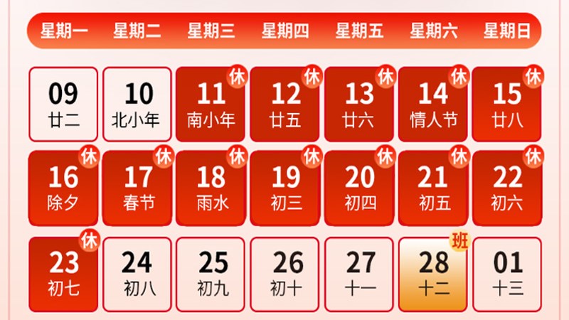 2026年2月11日(星期三,農(nóng)歷臘月廿四)至2026年2月23日(星期一,農(nóng)歷正月初七),共計13天。